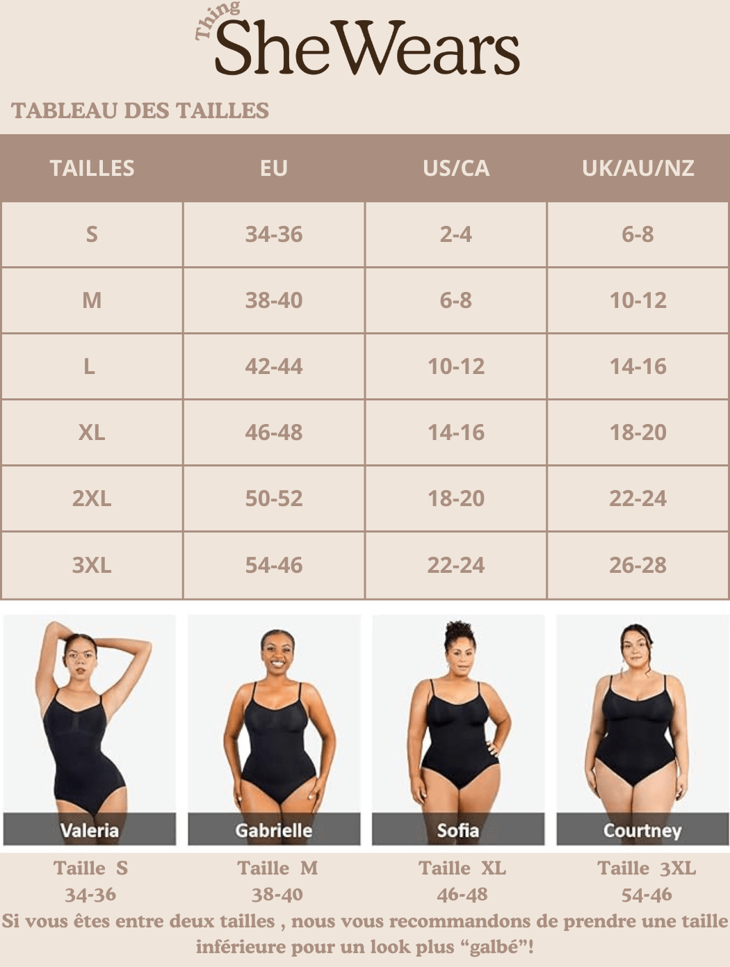 Vous recherchez un effet amincissant prononcé ? Une taille en dessous vous offrira une compression plus intense et mettra en valeur votre silhouette.